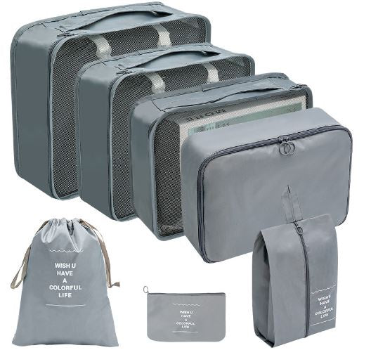 Our 7 piece set includes 4 packing cells,a laundry bag, a waterproof pouch (wet swimmers on last day) and a shoe bag!